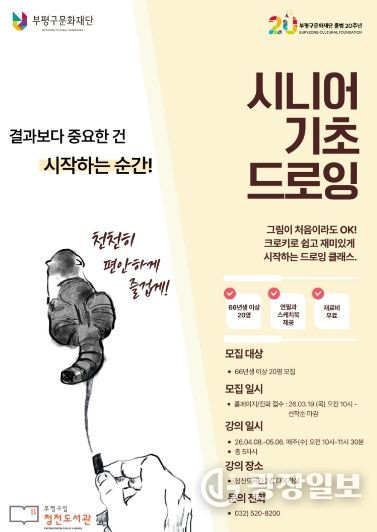 광장일보 주재영 기자 | 부평구 청천도서관은 오는 4월 8일부터 지역 어르신을 대상으로 문화예술 프로그램 ‘시니어 기초 드로잉’을 운영한다.