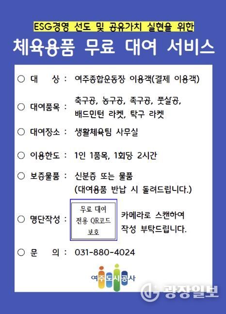 광장일보 주재영 기자 | 여주도시공사는 여주종합운동장 이용 시민들의 편의를 높이기 위해, 2023년부터 시행해 온 ‘체육용품 무료대여 서비스’를 오는 2026년 4월 1일부터 대폭 확대 운영한다.