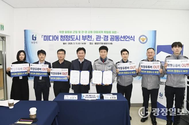 광장일보 주재영 기자 | 부천시와 부천원미경찰서는 지난 11일 중앙지구대에서 ‘미디어 청정도시 부천’ 관·경 공동 선언식을 열고 공공장소 촬영 질서 확립을 위한 협력 대응을 강화하기로 했다.