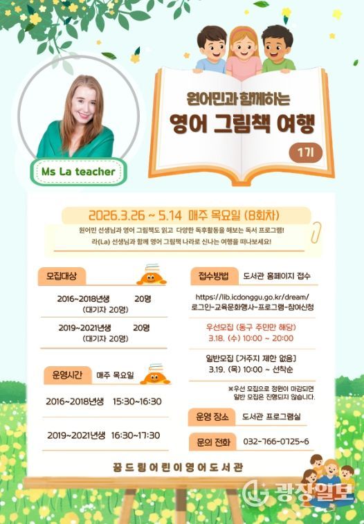 광장일보 주재영 기자 | 인천 동구는 꿈드림어린이영어도서관에서 오는 18일부터 ‘원어민과 함께하는 영어 그림책 여행(1기)’ 수강생을 선착순으로 40명 모집한다고 밝혔다.