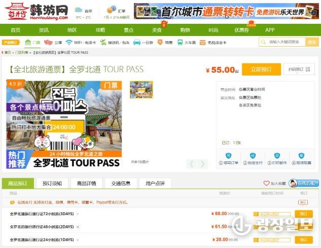 광장일보 주재영 기자 | 전북특별자치도는 도내 대표 관광상품인 ‘전북투어패스’를 중국 최대 한국 여행 정보 플랫폼인 ‘한유망(韩游网)’에 입점시키고 이달부터 본격적인 판매에 돌입했다고 12일 밝혔다.