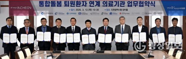 광장일보 주재영 기자 | 인천광역시는 3월 12일 시청 장미홀에서 상급종합병원 등 관내 10개 의료기관과 함께 '통합돌봄 퇴원환자 지역사회 연계 활성화를 위한 업무협약(MOU)'를 체결했다고 밝혔다,