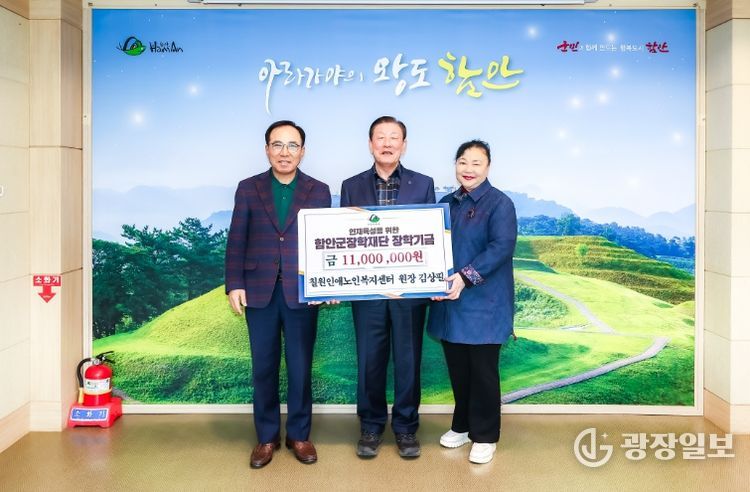 광장일보 주재영 기자 | 함안군은 지난 12일 칠원 인애노인복지센터가 지역 인재 육성을 위한 장학기금 1100만 원을 함안군 장학재단에 기탁했다고 밝혔다.