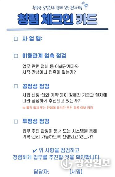 체크인 카드에는 ▲이해관계자와의 사적 접촉 여부 ▲사업 추진 과정의 공정성 ▲부당청탁 발생 여부 ▲업무 추진 과정의 기록 및 관리 가능 여부 등 업무 추진 시 점검해야 할 청렴 항목이 포함돼 있으며, 담당자가 업무 시작 단계에서 간단히 확인하도록 구성됐다. 특히 문화관광 분야는 민간단체 및 업체와의 협업이 많은 만큼, 이번 시책을 통해 업무 초기 단계에서 청렴 위험 요소를 점검함으로써 부패 발생 가능성을 사전에 예방하는 데 목적이 있다.