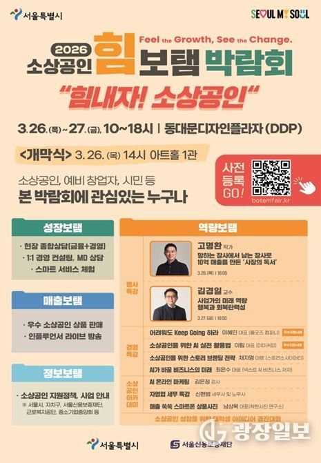광장일보 주리아 기자 | 서울시와 서울신용보증재단은 3월 26일부터 27일까지 이틀간 동대문디자인플라자(DDP)에서 ‘2026 소상공인 힘보탬 박람회’를 개최한다. 서울시 첫 소상공인 종합박람회로 금융·판로·교육 등 소상공인에게 필요한 정책과 정보를 총망라한 체험형 행사다.