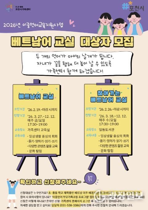 광장일보 주재영 기자 | 포천시 직영 ‘더 큰 행복 포천시가족센터’는 다문화 자녀의 이중언어 역량 강화를 위한 2026년 이중언어 교육지원사업 베트남 교실 수강생을 모집한다.