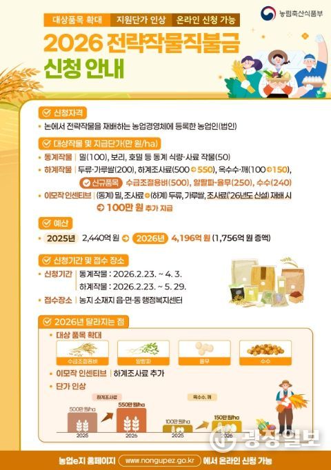 올해부터 전략작물직불제 하계 조사료 지원단가는 ha당 500만 원에서 550만 원으로 인상된다. 동계 밀·조사료와 하계 두류·가루쌀·조사료를 재배하는 이모작의 경우 ha당 100만 원이 추가 지원돼 논을 활용한 조사료 재배 확대가 기대된다.