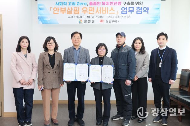 광장일보 이현나 기자 | 철원군은 2026년 3월13일 오전 10시, 철원군청 2층 군수 집무실에서 철원우체국(국장 최은애)과 ‘안부살핌 우편서비스’업무협약식을 체결했다.