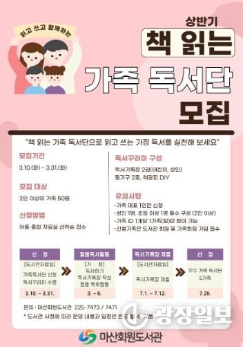 광장일보 주재영 기자 | 창원시 마산회원도서관은 가족 독서문화 확산을 위해 ‘책 읽는 가족 독서단’을 운영하고 3월 10일 부터 3월 31일까지 상반기 참여 가족을 모집한다.