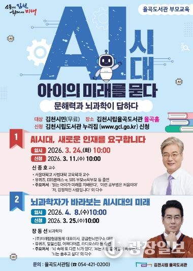 광장일보 주재영 기자 | 김천시립율곡도서관은 오는 3월 24일과 4월 8일 오전 10시, 율곡도서관 율곡홀에서 학부모를 대상으로 한 부모교육 특강 'AI 시대, 아이의 미래를 묻다'를 개최한다.
