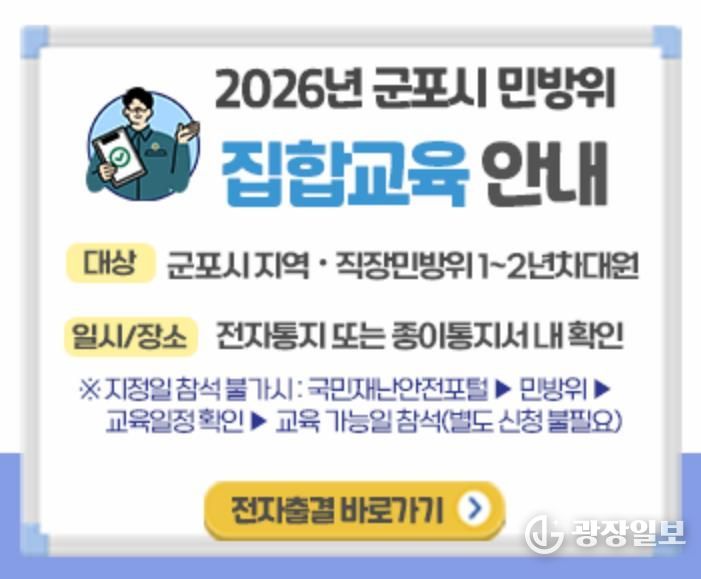 광장일보 주재영 기자 | 군포시는 민방위대원의 비상 시 대응 역량 강화를 위해 ‘2026년 민방위 기본교육’을 실시한다.