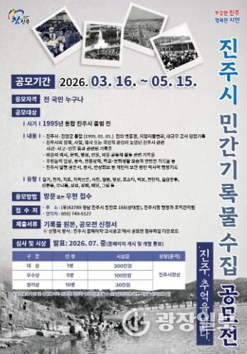 광장일보 주재영 기자 | 진주시는 사라져가는 지역의 옛 모습과 시민들의 소중한 생활사를 체계적인 기록 자산으로 보존하기 위해 ‘진주시 민간 기록물 수집 공모전: 진주, 추억을 담다’를 개최한다고 밝혔다.