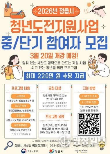 광장일보 주재영 기자 | 정읍시 청년지원센터(센터장 안태평) ‘청정지대’가 지역 청년들의 진로 탐색과 취업 역량 강화를 돕는 ‘2026 청년도전지원사업’ 운영을 본격적으로 시작한 가운데, 오는 20일 15주 과정의 ‘중기 2기’를 개강하며 미취업 청년들의 체계적인 사회 진입 준비를 돕는다.