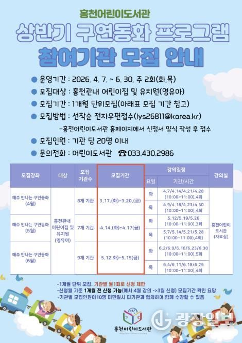 광장일보 이현나 기자 | 홍천군은 영유아에게 그림책을 통해 정서적 안정 및 사회성 향상에 도움을 주며 책과 도서관을 가까이할 기회 제공을 위한 2026년 상반기 홍천 어린이도서관 '매주 만나는 구연동화' 프로그램 참여기관을 모집한다.