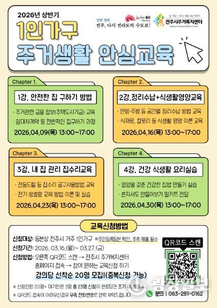 광장일보 주재영 기자 | 전주시 주거복지센터(센터장 오은주)는 1인 가구의 안정적이고 독립적인 주거 정착을 돕기 위해 오는 4월 9일부터 30일까지 매주 목요일 오후 1시부터 약 4시간 동안 전주시 실거주 1인 가구를 대상으로 ‘2026년 상반기 1인 가구 주거생활 안심교육’을 운영한다.