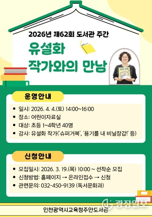 주안도서관 관계자는 “제62회 도서관 주간을 맞아 어린이 독자들이 유설화 작가와 소통하며 작품을 깊이 있게 이해하는 소중한 시간이 되길 바란다”며 “앞으로도 지역사회를 위해 풍성한 독서 문화 행사를 지속적으로 제공하겠다”고 밝혔다.