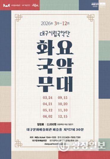 광장일보 주재영 기자 | 대구시립국악단은 3월부터 12월까지 총 8회에 걸쳐 대구문화예술회관 비슬홀에서 ‘화요국악무대’를 개최한다.
