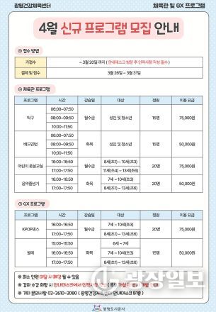 광장일보 주재영 기자 | 광명도시공사는 광명건강체육센터에서 시민들의 건강 증진과 생활체육 활성화를 위해 체육관 및 GX실 4월 신규 프로그램 회원을 모집한다고 밝혔다.