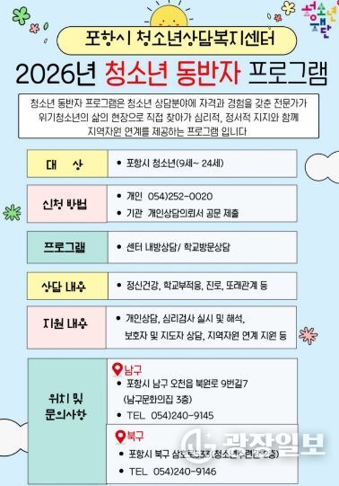 광장일보 주재영 기자 | 포항시청소년재단 청소년상담복지센터는 고위기 청소년을 대상으로 생활 현장을 직접 찾아가 지원하는 ‘2026년 청소년동반자 프로그램’을 연중 운영한다.