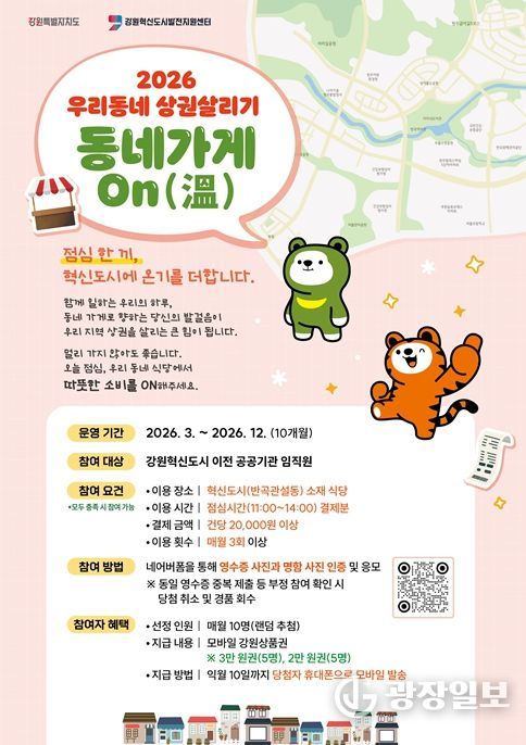 광장일보 이현나 기자 | (재)강원혁신도시발전지원센터에서는 강원혁신도시 이전 공공기관 임직원을 대상으로 지역 상권 활성화를 위한 ‘2026 우리동네 상권살리기 동네가게 On(溫)’사업을 추진한다고 밝혔다.