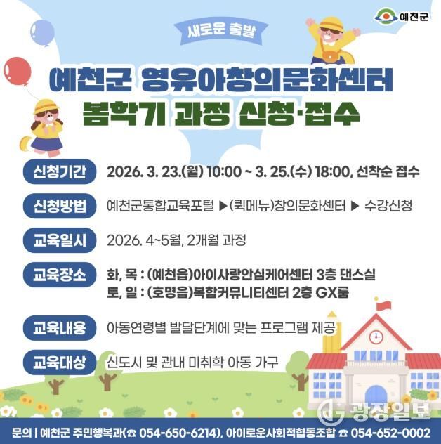 광장일보 주재영 기자 | 예천군은 관내 영유아의 건강한 성장과 창의력 발달을 지원하기 위해 예천군 영유아 창의문화센터 봄학기 프로그램 수강생을 모집한다.
