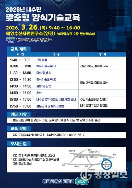 광장일보 박균현 기자 | 경기도해양자원연구소는 오는 26일 양평에 있는 연구소 생태학습관에서 내수면 양식 어업인의 역량 강화를 위한 양식기술교육을 실시한다.