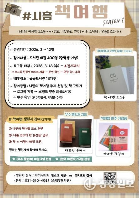 광장일보 주재영 기자 | 시흥시도서관은 시민의 독서 실천을 지원하고 일상 속 독서문화를 확산하기 위해 3월 18일부터 ‘2026 시흥 책여행(시즌2)’ 로그북을 배부하고, ‘책여행 로그북 챌린지’를 함께 운영한다.