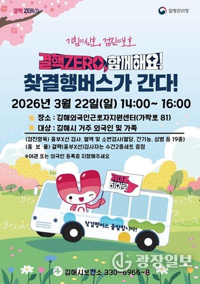 광장일보 주재영 기자 | 김해시는 제16회 결핵예방의 날(3월 24일)을 맞아 오는 22일 오후 2시부터 4시까지 김해외국인근로자지원센터에서 '찾아가는 외국인 무료 결핵검진'을 실시한다고 18일 밝혔다.