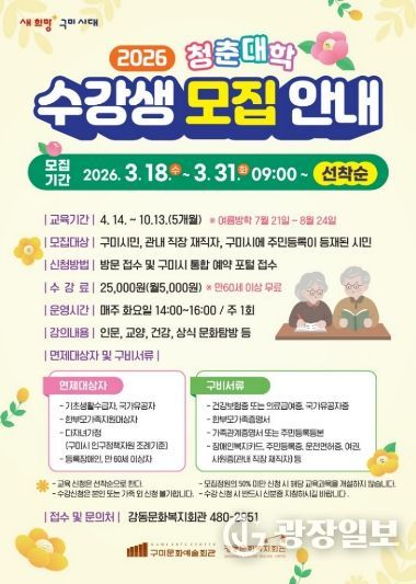 광장일보 주재영 기자 | 구미시강동문화복지회관은 3월 18일부터 3월 31일까지 ‘청춘대학’ 수강생을 모집한다.