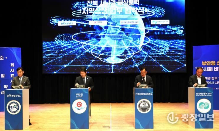 광장일보 주재영 기자 | 부안군은 18일 부안예술회관에서 열린 부안형 신바람 기본사회 비전 선포식에서 전북특별자치도, 전북자동차고등학교, 한국해상풍력(주)와 함께 전북 서남권 해상풍력 지역 상생 업무협약을 체결했다고 밝혔다.