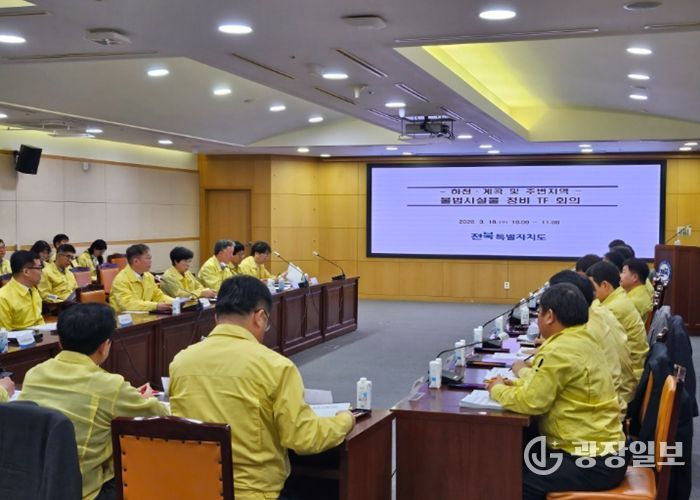 도는 18일 도청 중회의실에서 노홍석 행정부지사 주재로 ‘하천·계곡 및 주변 지역 불법시설 정비 TF 회의’를 열었다. 이날 회의에는 14개 시군 담당 국장과 도 관계 부서장 등 20여 명이 참석해 시군별 불법시설 현황과 정비 추진 방향을 집중 점검했다.