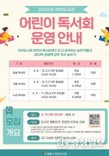 광장일보 주재영 기자 | 광명시 하안도서관은 어린이들이 올바른 독서 습관을 형성하고 기초 문해력을 기를 수 있도록 ‘2026년 어린이 독서회’ 참여 회원을 모집한다.