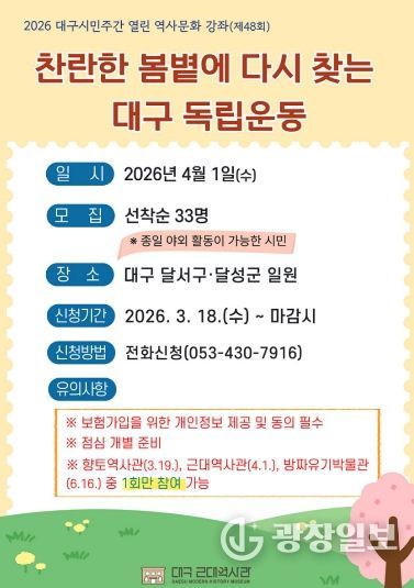 광장일보 주재영 기자 | (재)대구문화예술진흥원 박물관운영본부 소속 대구근대역사관은 2026 대구시민주간 연계행사로 4월 1일 대구시 달서구와 달성군 일원의 대구 독립운동가와 문화유산을 찾아보는 ‘찬란한 봄볕에 다시 찾는 대구 독립운동’ 답사를 개최하며, 참가자를 모집한다.