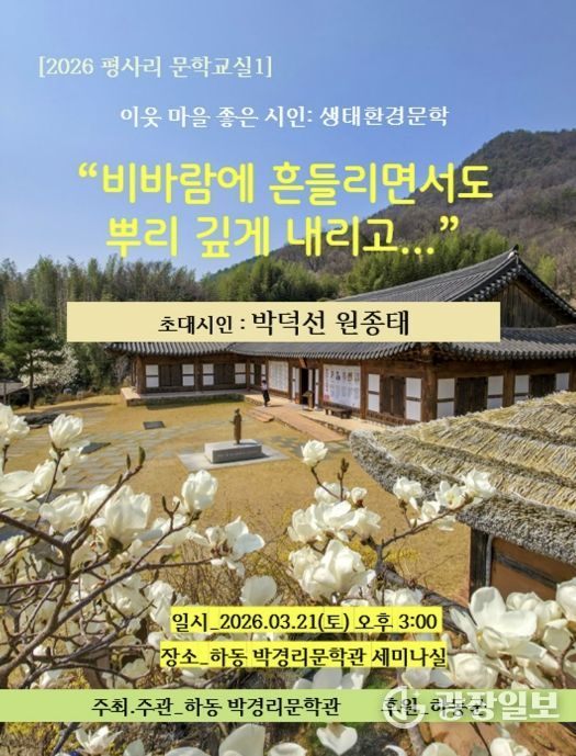 광장일보 주재영 기자 | 하동 박경리문학관이 오는 3월 21일 오후 3시, 문학관 내 세미나실에서 ‘2026 평사리문학교실1 : 이웃 마을 좋은 시인-생태환경문학’ 강연을 개최한다.