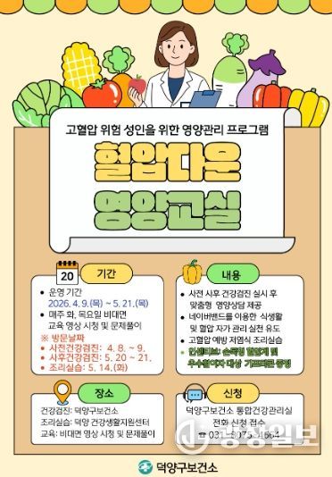 아울러 오는 5월 14일 고혈압 예방을 위한 저염식 조리실습이 덕양건강생활지원센터에서 진행된다. 해당 실습은 선택적 프로그램으로, 올바른 식생활을 직접 체험하고 실천 능력 향상에 도움을 줄 것으로 기대된다.