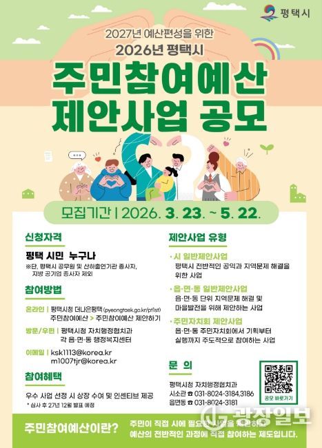 광장일보 박균현 기자 | 평택시가 3월 23일부터 5월 22일까지 2027년도 예산 편성을 위한 2026년도 주민참여예산 제안사업 공모를 시행한다.
