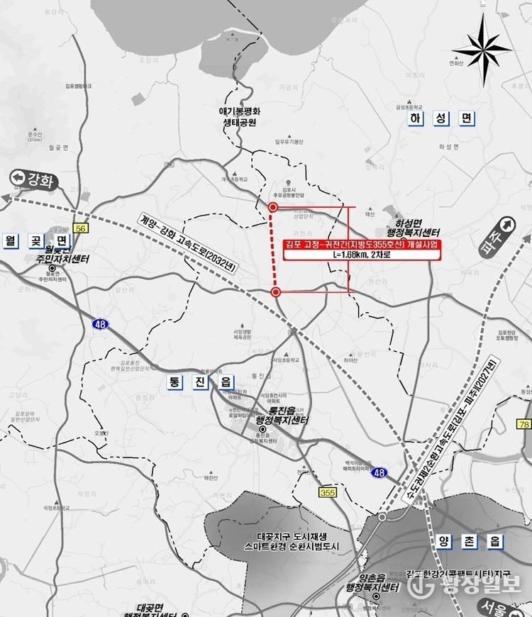 김포시가 제안한 지방도 355호선(고정~귀전) 도로개설사업은 연장 1.68km, 사업비 317억 원 규모로, 교통혼잡 개선 분야의 핵심사업에 포함됐다. 해당 구간은 국지도 56호선과 지방도 355호선을 연결하며, 계양~강화 고속도로 서암IC와의 접근성 향상에 따라 진·출입 교통량 증가가 예상돼 도로 확충의 필요성이 제기된 바 있다.