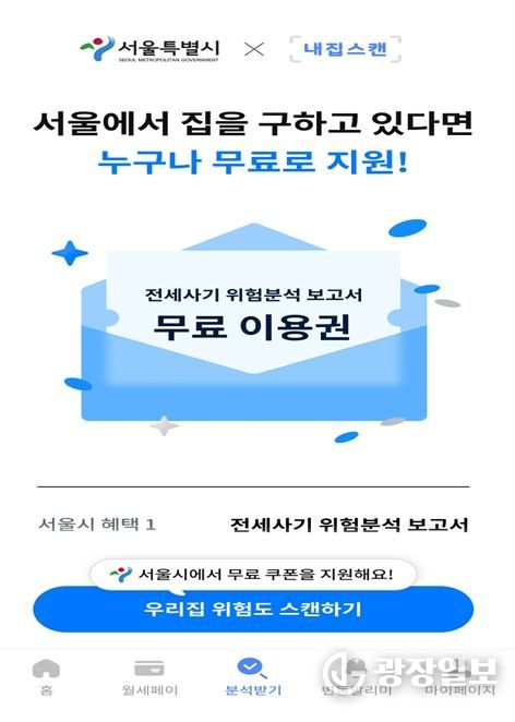 서울 지역에서 임대차계약을 예정한 만 39세 이하 청년은 서울주거포털, 청년몽땅정보통의 전세사기 위험분석 보고서 배너를 통해 ‘내집스캔’에 접속한 뒤, 서울시 무료 쿠폰을 적용해 이용할 수 있다. 25일부터 1인 최대 2회까지 무료로 지원된다.