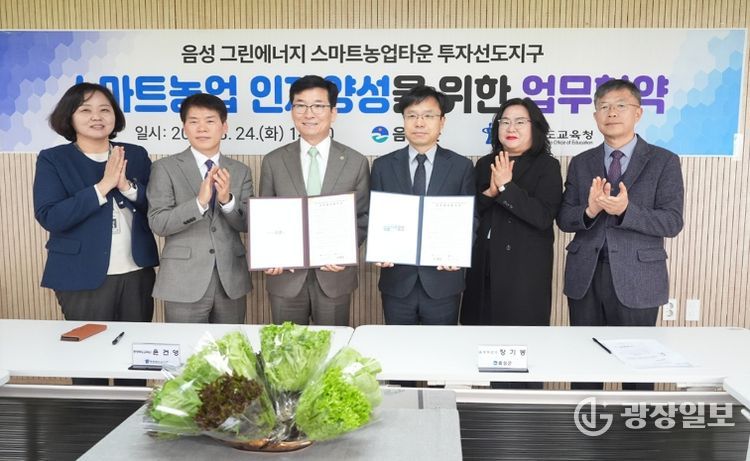 광장일보 이현나 기자 | 음성군은 24일 H&A 스마트팜과 그린에너지 스마트농업타운 대상지 일원에서 충청북도교육청과 함께 지역 교육발전 방향과 미래 인재 양성 협력방안을 모색하기 위한 정책간담회를 열고 공동협약을 체결했다.