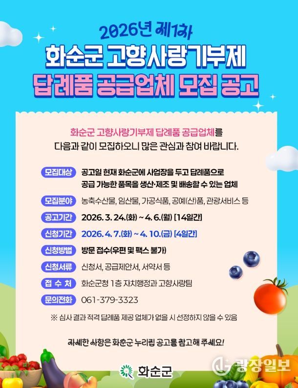 광장일보 주재영 기자 | 화순군은 24일 고향사랑기부제 활성화와 기부자 만족도 제고를 위해 2026년 제1차 고향사랑기부제 답례품 및 공급업체를 모집한다고 밝혔다.