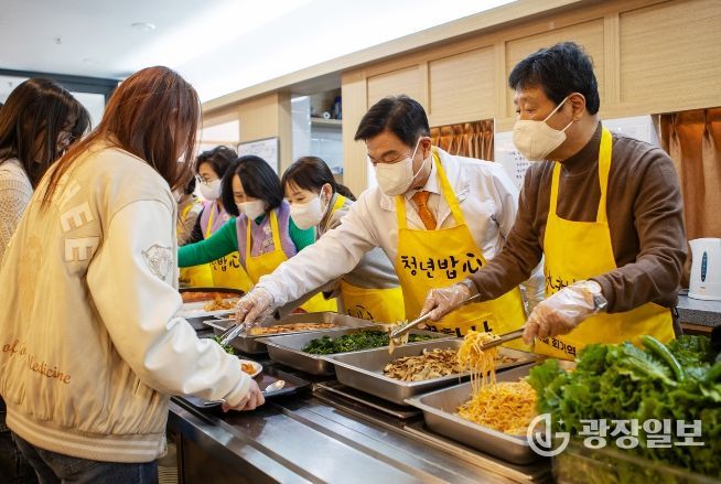 광장일보 주재영 기자 | 서울 동대문구 경희대 정문 옆 연화사 공양간에 점심시간을 앞두고 대학생들이 하나둘 모여들었다. 수업을 마친 학생들이 줄을 서자 사찰 안은 금세 북적였다. 스님들과 자원봉사자들이 분주히 음식을 나르고, 공양간 앞에서는 학생들끼리 “오늘 메뉴가 뭐냐”며 웃음 섞인 대화를 주고받았다. 그 줄 앞에 이필형 동대문구청장도 섰다. 학생들에게 직접 음식을 건네며 “밥 잘 챙겨 먹고, 학업과 미래 준비도 힘내라”고 말을 건넸다. 이 구청장은 연화사 ‘청년밥心’ 현장에서 배식자로 참여해 대학생들을 격려했다.
