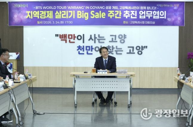 시는 지난 24일 시청 대회의실에서 ‘지역경제 살리기 빅 세일 주간’ 추진을 위한 업무협의를 개최했다. 회의에서는 BTS 월드투어 고양 콘서트의 성공적 개최를 기원하고, 지역 경제 활성화와 민생회복 계기를 마련하기 위한 지역경제 살리기 빅 세일 주간을 자발적인 시민 참여형 이벤트로 추진하는 방안을 논의했다.