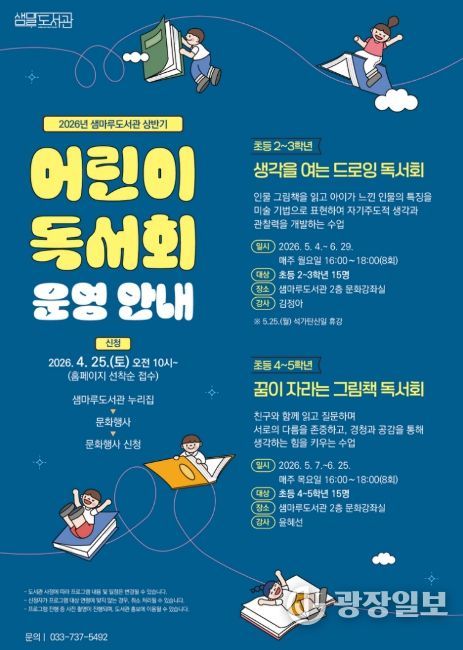 광장일보 이현나 기자 | 원주시 샘마루도서관은 오는 5월부터 6월까지 관내 어린이를 대상으로 ‘상반기 어린이 독서회’을 운영한다.