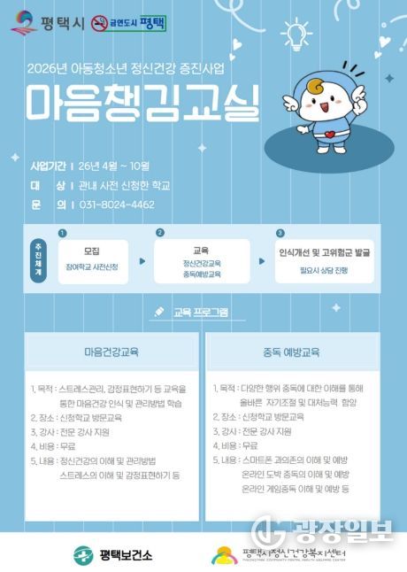 광장일보 박균현 기자 | 평택시는 스쿨케어 사업의 일환으로 관내 학교 학생들을 대상으로 『마음챙김교실』을 운영한다고 밝혔다. 이번 프로그램은 학생들이 교육을 통해 정신건강을 올바르게 인식하고 스스로 관리할 수 있도록 지원함으로써 마음 건강 증진을 도모하는 데 목적이 있다.
