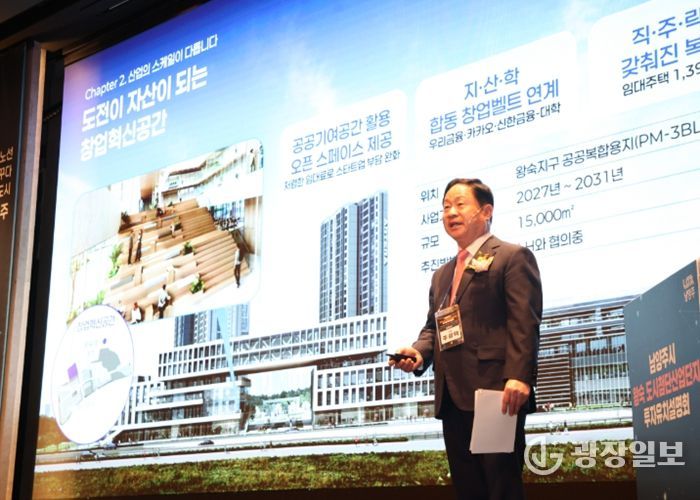 행사는 김영록 벤처기업협회 부회장의 기조강연으로 시작됐다. 이어 주광덕 남양주시장이 직접 왕숙 도첨산단의 투자 강점을 설명했다.