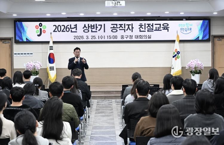 광장일보 나학천 기자 | 대전 중구는 25일 중구청 대회의실에서 공직자의 소통 능력 및 민원응대 역량 강화를 위해 직원 150여 명을 대상으로 ‘2026년 상반기 친절교육’을 실시했다고 밝혔다.