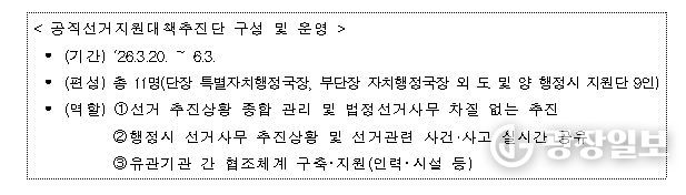 소통청렴담당관이 총괄하고 3개 반 10명의 감찰 인력이 투입되며, 공직자의 선거중립 의무 위반, 민생현안 방치, 선심성 예산집행, 공직기강 해이 등을 집중 점검한다.