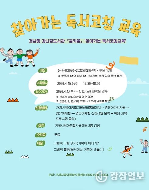 광장일보 주재영 기자 | 거제시육아종합지원센터는 오는 4월 15일, 거제시 관내 5~7세 영유아 자녀를 둔 가정을 대상으로 ‘찾아가는 독서코칭 교육’을 실시한다.