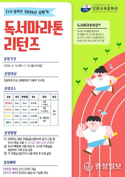 광장일보 이현나 기자 | 강릉교육문화관은 지역 내 책 읽는 문화 확산을 위해 4월부터 12월까지 학생 및 성인을 대상으로 ‘2026년 독서마라톤 리턴즈’를 운영한다.