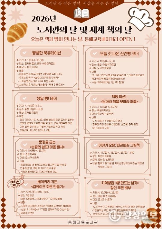 광장일보 이현나 기자 | 동해교육도서관은 4월 12일 도서관의 날과 4월 23일 세계 책의 날을 맞아 ‘오늘은 책과 빵이 만나는 날, 동해교육베이커리 오픈(OPEN)!’을 주제로 지역주민과 함께하는 독서문화 행사를 운영한다.